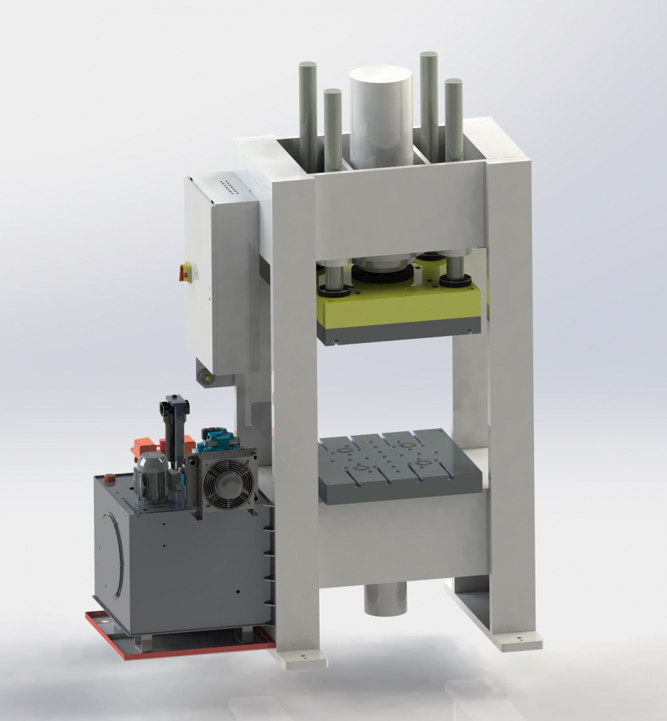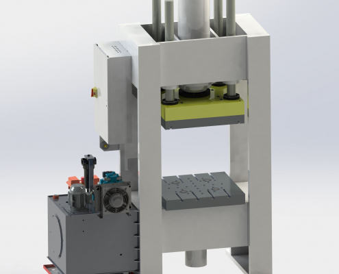 Die hier gezeigte Maschine wurde bereits in Kundenauftrag gebaut und ausgeliefert. Wir können Ihnen diese Maschine sehr kurzfristig neu fertigen – gern unter Berücksichtigung individueller Optionen. Es handelt sich um eine hydraulische Tiefziehpresse mit integrierter Ziehkissenfunktion für Umformprozesse, Zieharbeiten und präzise Blechbearbeitung.