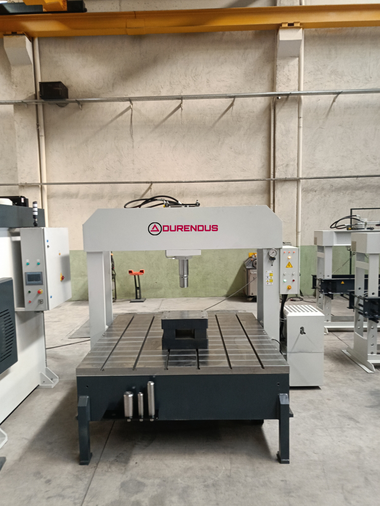 Die hier gezeigte Maschine wurde bereits in Kundenauftrag gebaut und ausgeliefert. Wir können Ihnen diese Maschine sehr kurzfristig neu fertigen. Es handelt sich um eine hydraulische Portalrichtpresse des Herstellers DURENDUS mit einer maximalen Presskraft von 200 t. Die Maschine verfügt über eine Tischgröße von 1.500 × 2.000 mm, eine maximale Einbauhöhe von 800 mm sowie einen Hub von 400 mm und eignet sich damit ideal für Richtarbeiten, Einpressprozesse sowie Anwendungen im Stahlbau und Werkzeugbau.